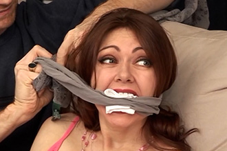He ties her wrists in front, then shoves a stuffer in her mouth, followed by a cleave-gags her. He pulls her arms up and over her head, then attaches them behind the sofa. Then he strips her panties off of her and ties her legs spread wide apart — for easy access to the pussy of course! With Natasha all bound and gagged, the robber pulls up her dress and fondles her tits and crotch. Then he lets her know he plans to screw her!